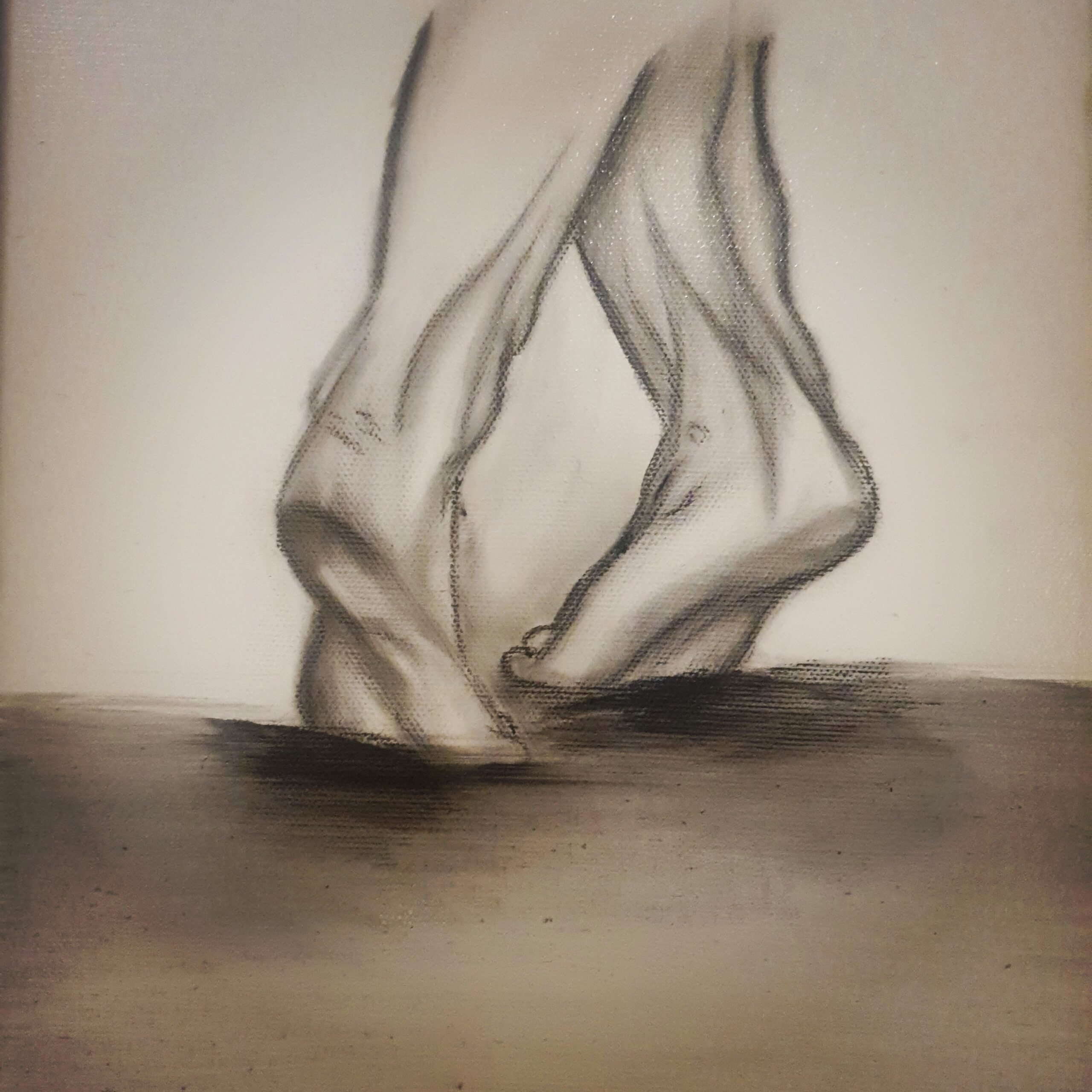 تعبر عن المرأة حافية القدمين الحائرة بخطها لاتعلم هل تلك الحذر سيبقها بأمان أم سينقلها لعالم مجهول ومخيف
